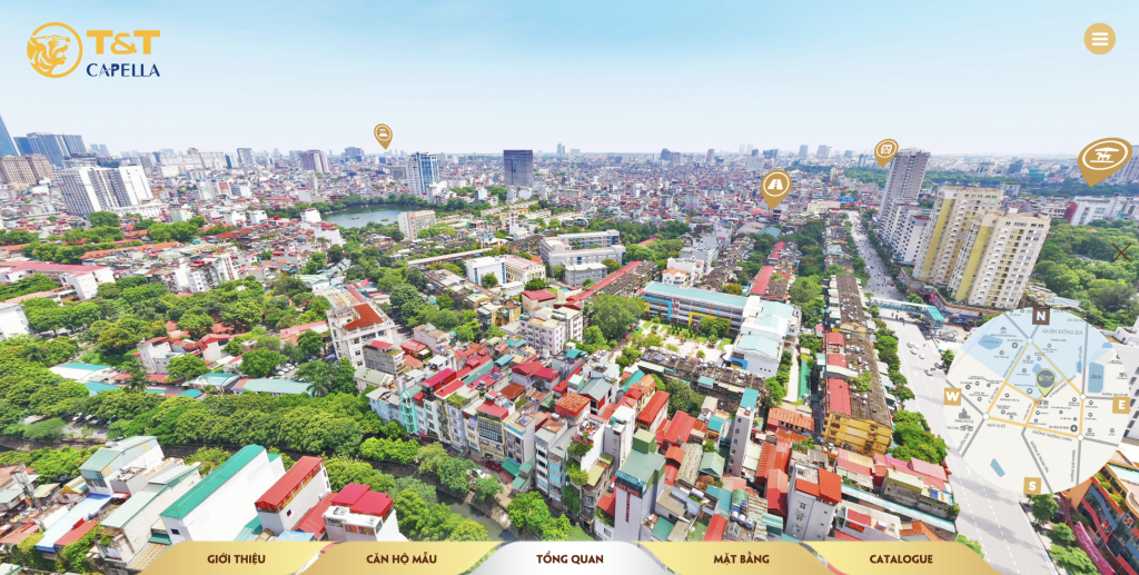 Trước hết, view flycam của dự án quay được bao quát toàn bộ không gian bên ngoài của T&T Capella. Không chỉ vậy, các điểm đến tham quan xung quanh khu chung cư cao cấp này cũng được ghi rõ và chú thích thêm hình ảnh.