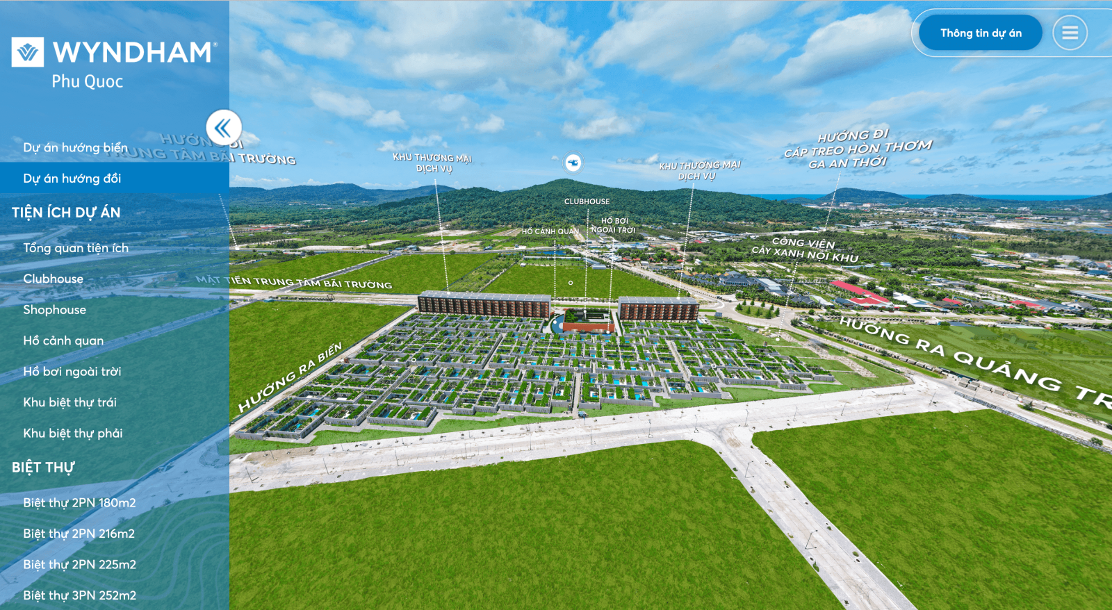 Dự án cung cấp view flycam toàn cảnh bao quát toàn bộ các tiện ích nổi bật của Wyndham Phú Quốc. Mỗi tiện ích nổi bật đều được chú thích rõ ràng để người xem tiện trải nghiệm và tìm hiểu hơn.
