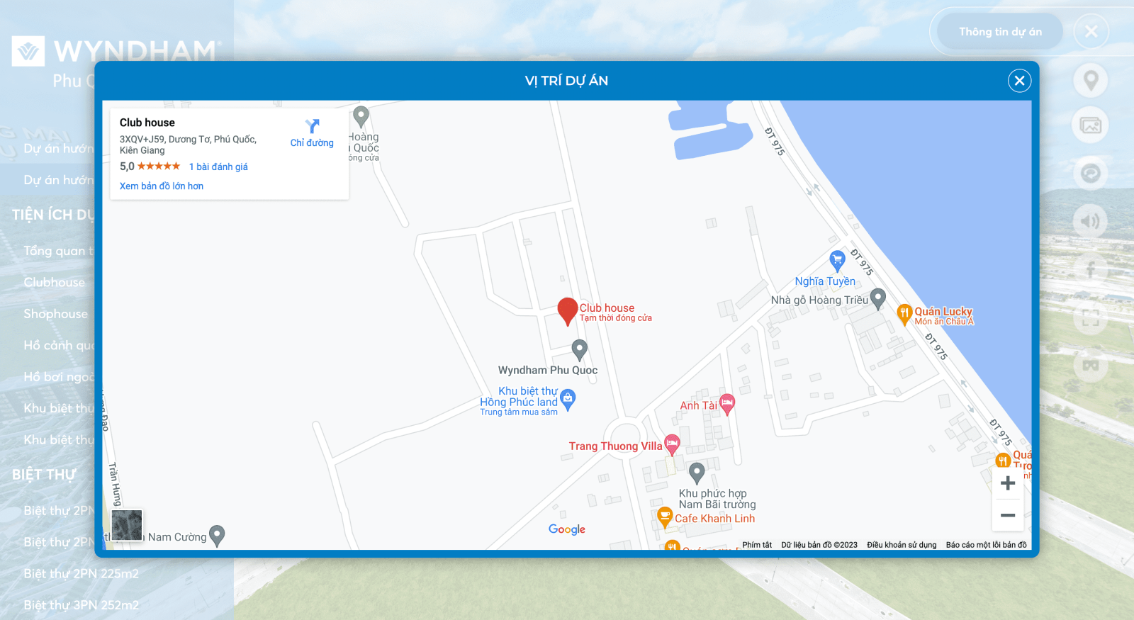 Bên cạnh đó, khách hàng cũng có thể xem vị trí chính xác của Wyndham Phú Quốc trên bản đồ vị trí trực tiếp được tích hợp với Google Maps, giúp khách hàng có được một chuyến “trải nghiệm ảo" thuận lợi và đầy đủ tiện ích nhất.