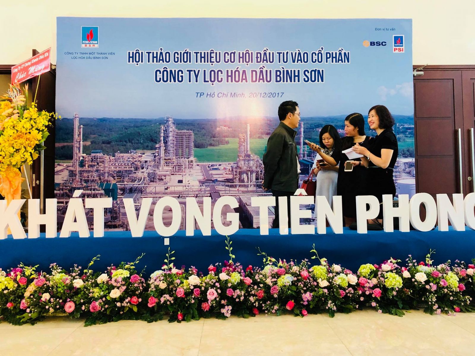 Ngày 20/12/2017 vừa qua, HMG hân hạnh trở thành đơn vị tổ chức chuỗi Hội thảo “Giới thiệu cơ hội đầu tư vào cổ phần công ty TNHH MTV Lọc hóa dầu Bình Sơn (BSR)”. Hội thảo đầu tiên diễn ra tại Sở Giao dịch Chứng khoán TPHCM với sự tham dự của đại diện Văn phòng Chính phủ, Bộ Công Thương, Phó Tổng giám đốc PVN Lê Mạnh Hùng và hơn 200 đại biểu đại diện cho các nhà đầu tư trong và ngoài nước quan tâm đến cổ phần Lọc hóa dầu Bình Sơn.